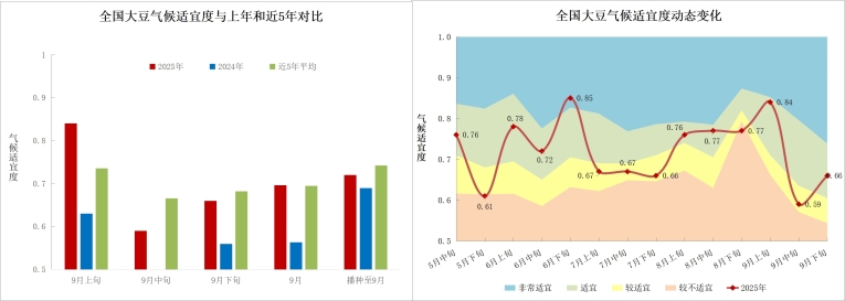 播种以来,全国大豆平均气候适宜度为0.72,比上年同期高0.03、比近五年平均低0.02,适宜度等级为适宜。其中,9月全国大豆平均气候适宜度为0.70,比上年同期高0.14,与五年同期持平,适宜度等级为适宜(图8)。