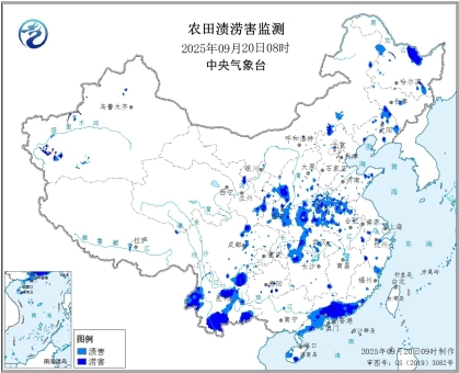 华北大部、黄淮东部和西北地区大部水热条件利于作物产量形成,豫陕晋等地多雨影响秋收。气温接近常年或偏高、大部墒情适宜或略偏湿,利于玉米、大豆等后期产量形成。西北地区东南部、黄淮西部和南部秋雨特征突出,充沛的降水有效增加了土壤水分,陕西南部、河南等地旱情缓解;但陕西南部、山西南部、河南大部、山东南部等地降水偏多1~4倍,降水日数有14~24天,较常年同期偏多8~14天,降水过程主要为9月2-5日、10-12日、15-17日和18-22日,且强降水落区重叠度高、局地极端性强,导致陕西、河南等地部分地区出现阶段性农田渍涝(图4),日照偏少3~8成,不利玉米、大豆、花生等充分灌浆,已成熟地块农机下地作业受阻,影响秋收作物收获晾晒,局地倒伏玉米出现穗发芽现象,河南、陕西、山西秋收进度偏慢。
