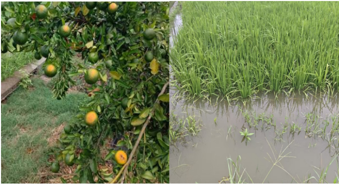 图5 浙江龙游柑橘日灼(左)和广东阳江稻田受淹(右)