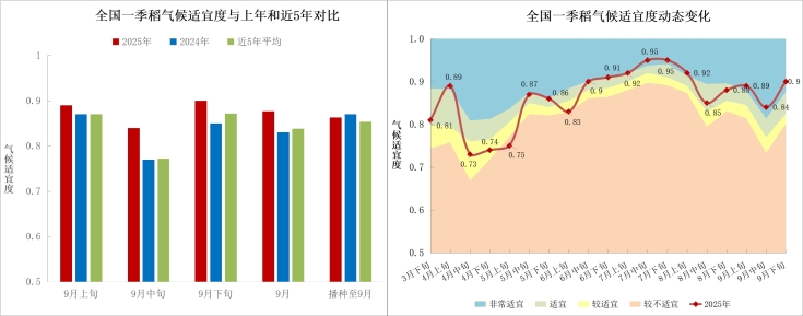播种以来,全国一季稻平均气候适宜度为0.86,略高于近五年平均、略低于上年同期,适宜度等级为适宜。其中,9月全国一季稻平均气候适宜度为0.88,比近五年平均、上年同期分别高0.04和0.05,适宜度等级为非常适宜(图6)。