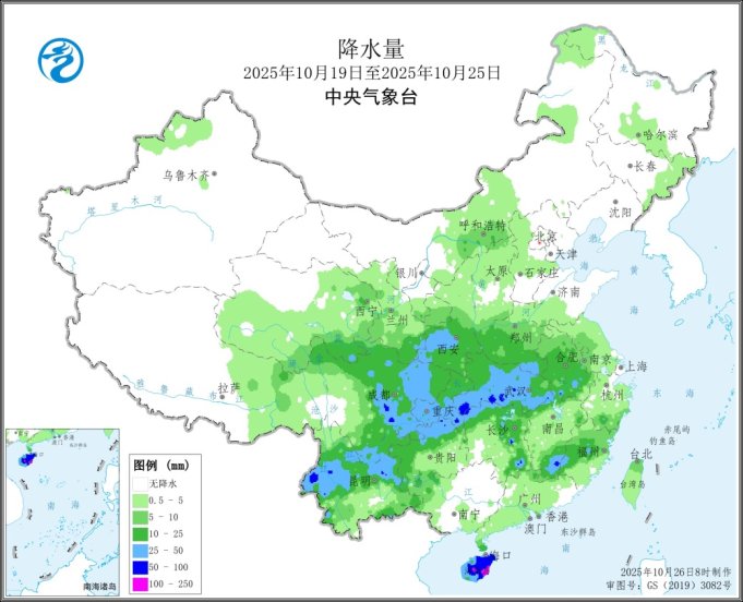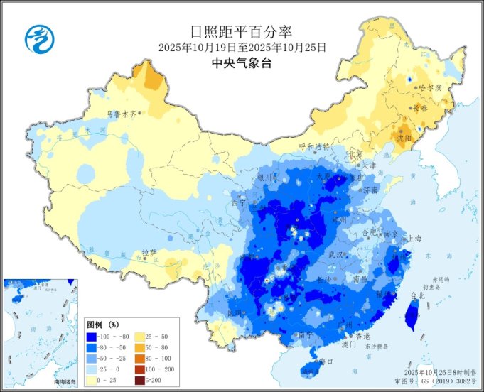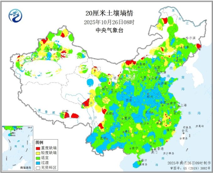 本周(2025年1019-10月25,受冷空气影响,全国大部农区平均气温常年同期偏低1~4东北地区中部和南部、内蒙古东部、河北大部、山东中部、河南大部、安徽北部、湖北大部、湖南北部、贵州北部等地偏低4~6℃,局地偏低6℃以上(图1)。周内,陕西西南部、湖北大部、四川东北部、重庆南部、贵州北部、云南北部等地降水量有25~50毫米,局地50~100毫米(图2),较常年同期偏多1~2倍;全国其余农区降水量不足25毫米或无有效降水。西北地区东部、华北南部、黄淮西部、江汉、江淮东部、江南、华南、西南地区等地日照时数较常年同期偏少3成以上东北地区中部和南部偏多3~5全国其余农区接近常年同期(图3)。