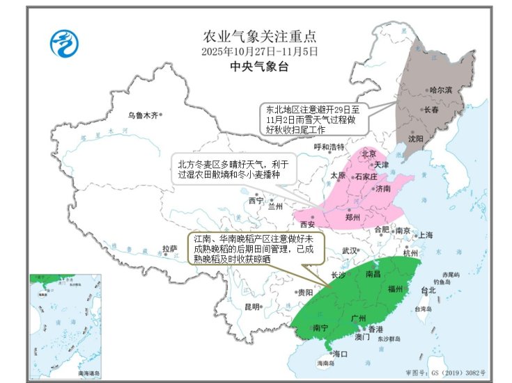 建议:东北地区注意避开雨雪天气做好秋收扫尾已收物晾晒存储工作,确保颗粒归仓北方冬麦区利用晴好天气加快推进整地进度,根据土壤墒情合理调整播种量、播种深度等,做到能播尽播长江中下游地区注意趁墒播种油菜、蔬菜等秋冬作物,已出苗的油菜加强水肥管理,促进形成壮苗西南地区注意保持沟渠畅通,根据土壤墒情合理开展秋种江南、华南注意做好未成熟晚稻的后期田间管理,已成熟晚稻及时收获晾晒