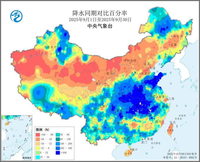 图2 2025年9月全国降水量与常年(上)和2024年(下)同期对比