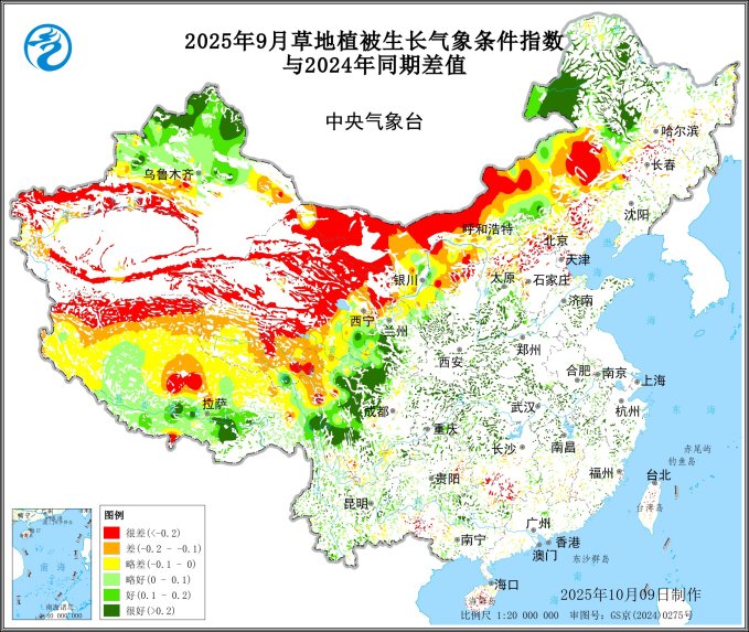 图3 2025年9月全国草原生态气象条件与去年同期对比