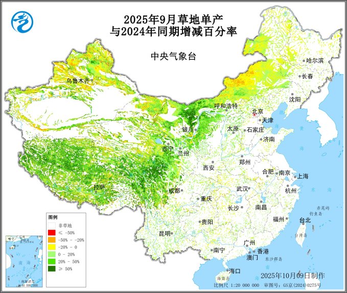 草原生态气象模型综合估算结果表明:2025年9月,全国大部草原区牧草长势接近或略好于去年同期,尤其西藏大部、青海南部、宁夏北部、内蒙古西部等地牧草产量较去年同期偏高20%~50%及以上;内蒙古中部偏北地区、新疆北部等地受前期旱情影响,产草量较去年同期偏低10%~20%,部分地区减产20%~50%(图4)。