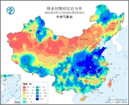 图1 2025年9月全国降水量与常年(左)和2024年(右)同期对比