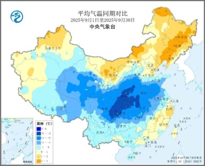 图2 2025年9月全国平均气温与常年(左)和2024年(右)同期对比