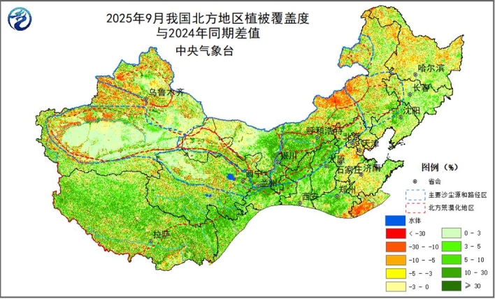 9月,北方荒漠化区大部气温接近常年同期略偏高(图2左),与2024年同期基本持平(图2右),仅青海中北部等地偏低1~4℃,热量条件总体能满足植被生长所需。