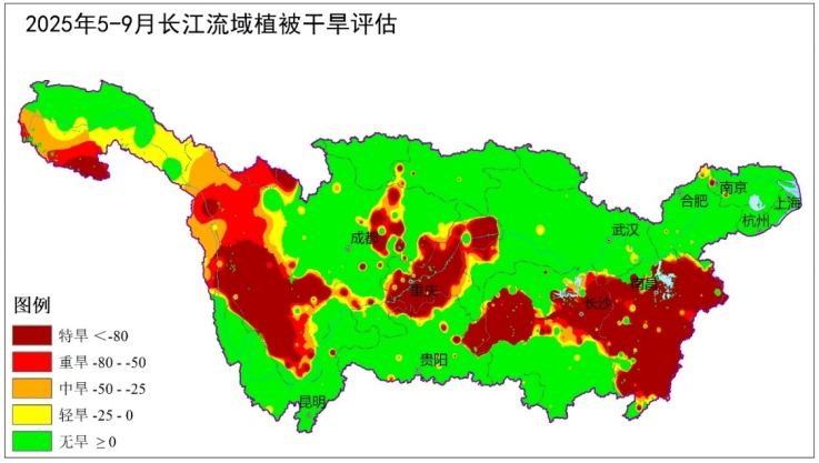 2025年主汛期(5-9月),长江流域大部气温较2024年同期略偏低,仅江西大部、湖南南部等地略偏高(图1)。2025年主汛期,长江流域降水分布不均,其中陕西南部、湖北、湖南西北部、重庆东北部和西北部、四川东部、贵州西部、云南北部等地大部降水较2024年同期偏多2成至1倍,湖北西部部分地区偏多1~2倍(图2);江西、湖南、四川四部等地大部降水偏少1~5成,尤其7月出现持续温高雨少天气,部分地区出现阶段性高温干旱(图3),不利于植被生长、抑制了生态功能发挥。