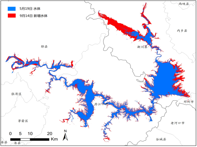 2025年主汛期(5-9月),鄱阳湖湖口站和洞庭湖城陵矶站水位呈现“涨-落-涨”特征,但受降水偏少影响,整体水位持续偏低,其中鄱阳湖湖口站水位全程在警戒水位以下低位运行;洞庭湖城陵矶站高水位持续时间、最高水位等均显著低于2024年同期。此外,丹江口水库5月受汉江流域汛前气象干旱影响,加之南水北调中线工程持续运行,水位降至150米死水位线以下,水库水体面积锐减;6-8月持续低水位运行。但8月下旬汉江流域进入秋雨期,旱涝急转特征突出,汉江上游累计雨量相较常年同期偏多1.7倍,位列1961年以来第1位,水库水位迅速回升,卫星遥感监测显示9月水体面积较5月增长5成(图4)。