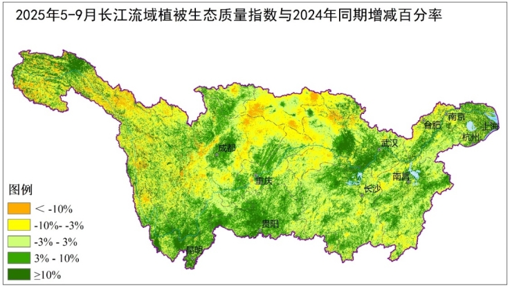 图5 2025年5-9月长江流域植被生态质量指数与2024年同期对比