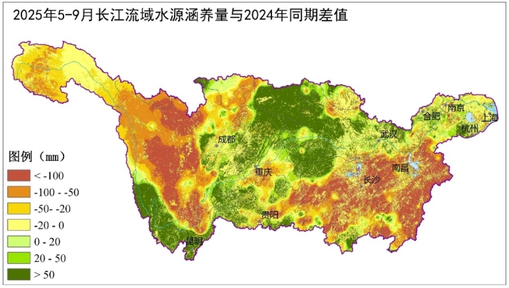 图7 2025年5-9月长江流域水源涵养功能与2024年同期对比