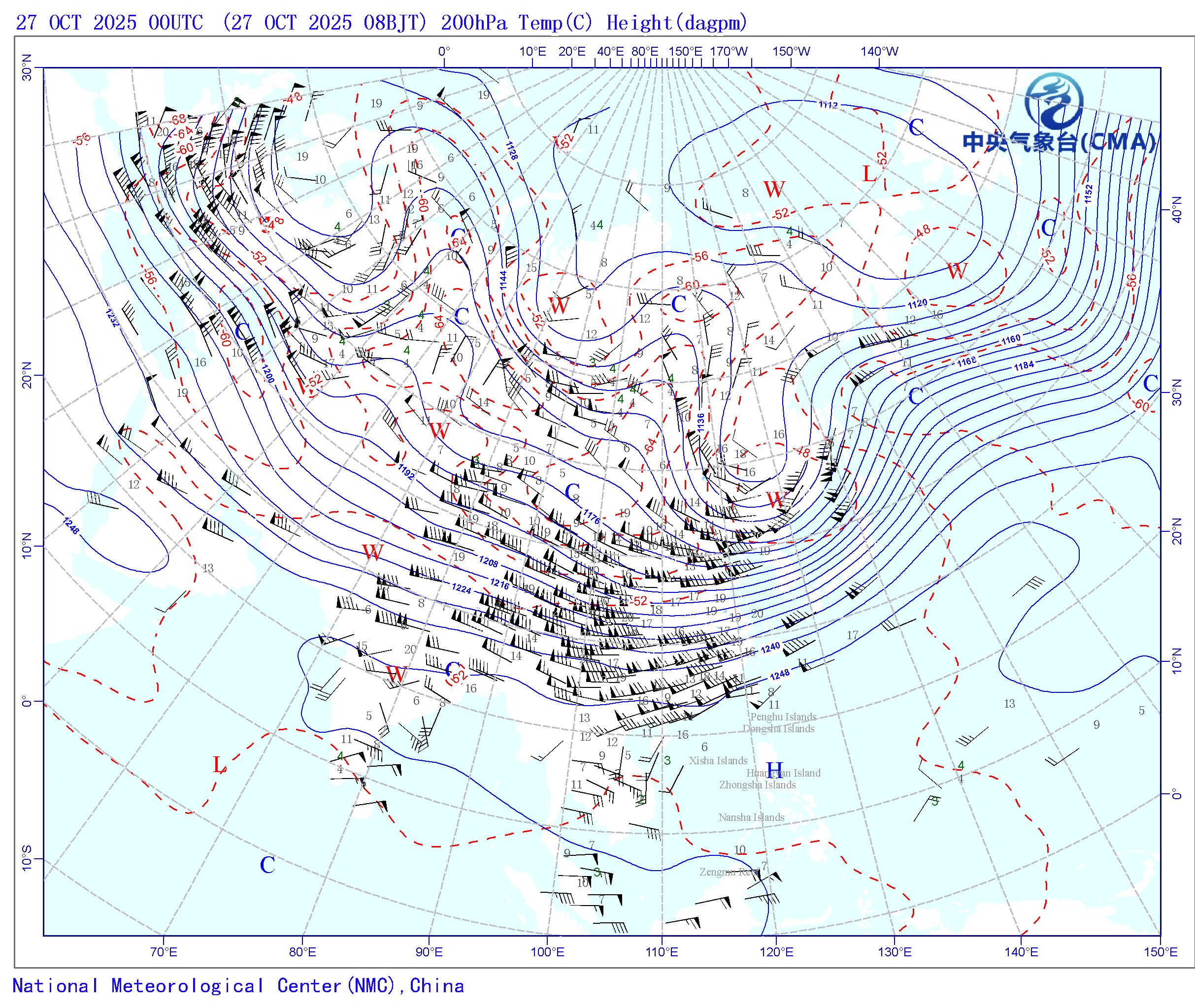 站点的填图要素包括:风向风速和温度露点差;天气系统符号包括:高压中心(H)、低压中心(L)、暖中心(W)、冷中心(C)和台风符号;蓝色等值线为等高线(单位dagpm);红色等值线为等温线(单位℃),其中零摄氏度以下以虚线显示。