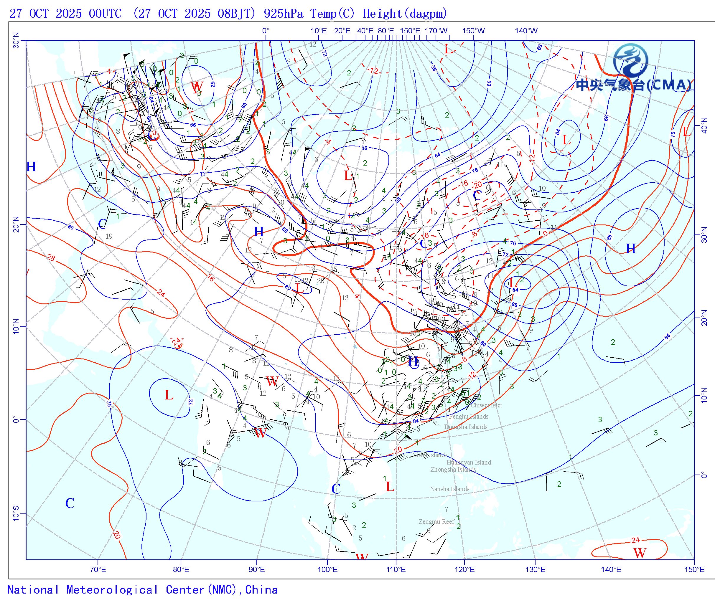 站点的填图要素包括:风向风速和温度露点差;天气系统符号包括:高压中心(H)、低压中心(L)、暖中心(W)、冷中心(C)和台风符号;蓝色等值线为等高线(单位dagpm);红色等值线为等温线(单位℃),其中零摄氏度以下以虚线显示。