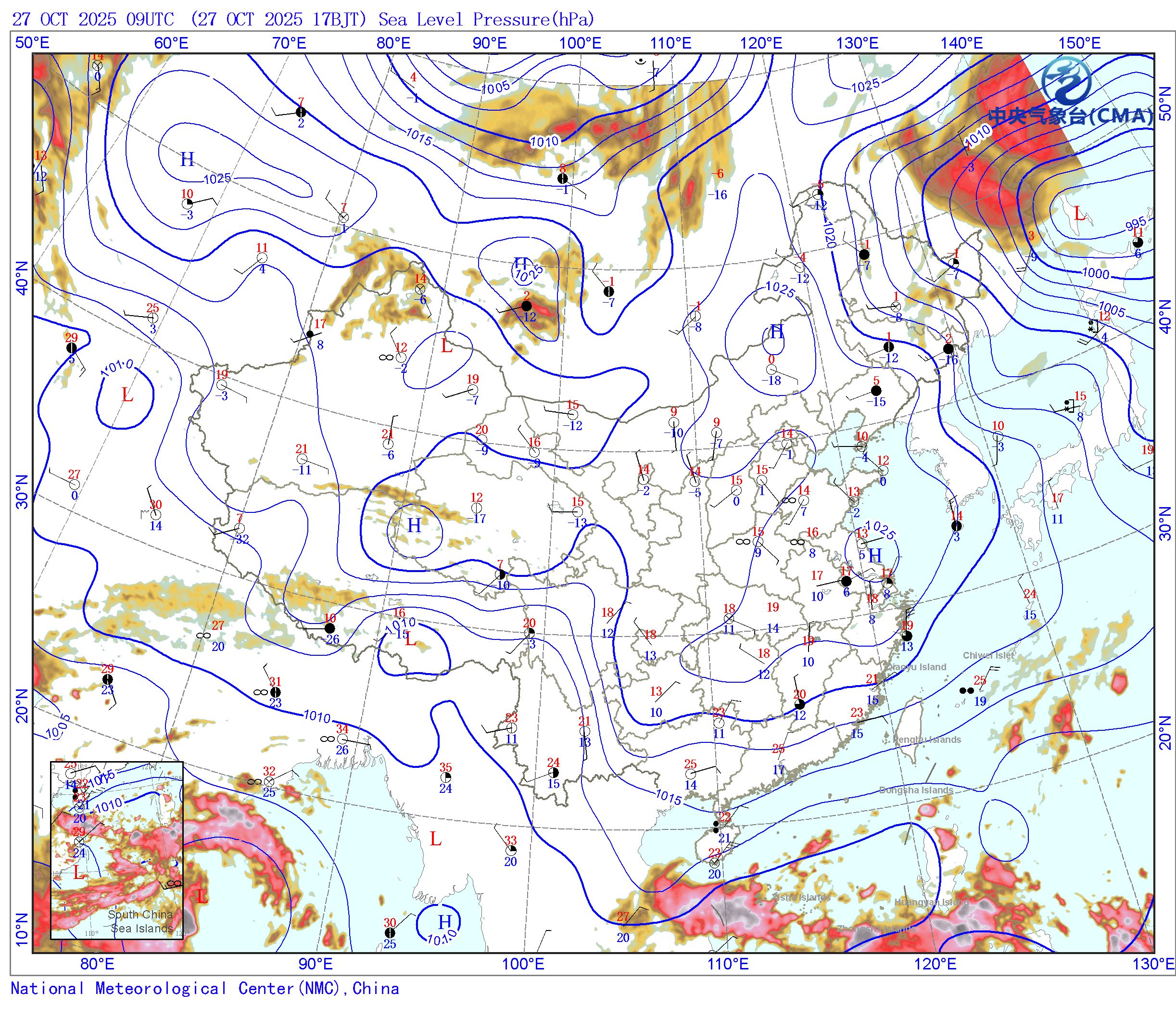 站点的填图要素包括:云量、风向风速、天气现象、温度(红色数字)和露点(蓝色数字);天气系统符号包括:高压中心(H)、低压中心(L)、冷锋(带三角形蓝色线段)、暖锋(带半圆形红色线段)和台风符号;蓝色等值线为海平面气压场等压线(单位hPa);底层填色为地形高度;顶层填色为红外卫星云图。