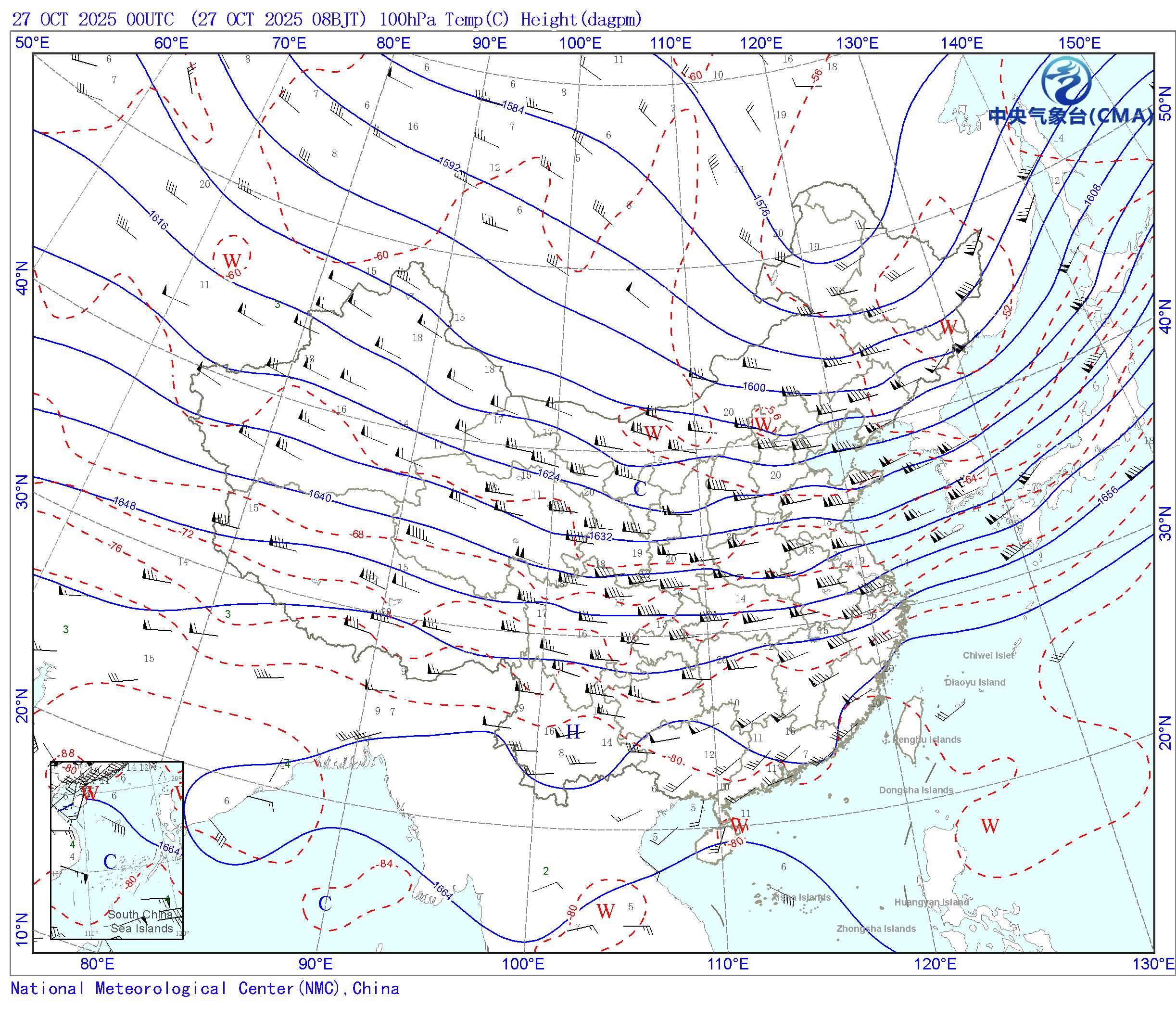 站点的填图要素包括:风向风速和温度露点差;天气系统符号包括:高压中心(H)、低压中心(L)、暖中心(W)、冷中心(C)和台风符号;蓝色等值线为等高线(单位dagpm);红色等值线为等温线(单位℃),其中零摄氏度以下以虚线显示。