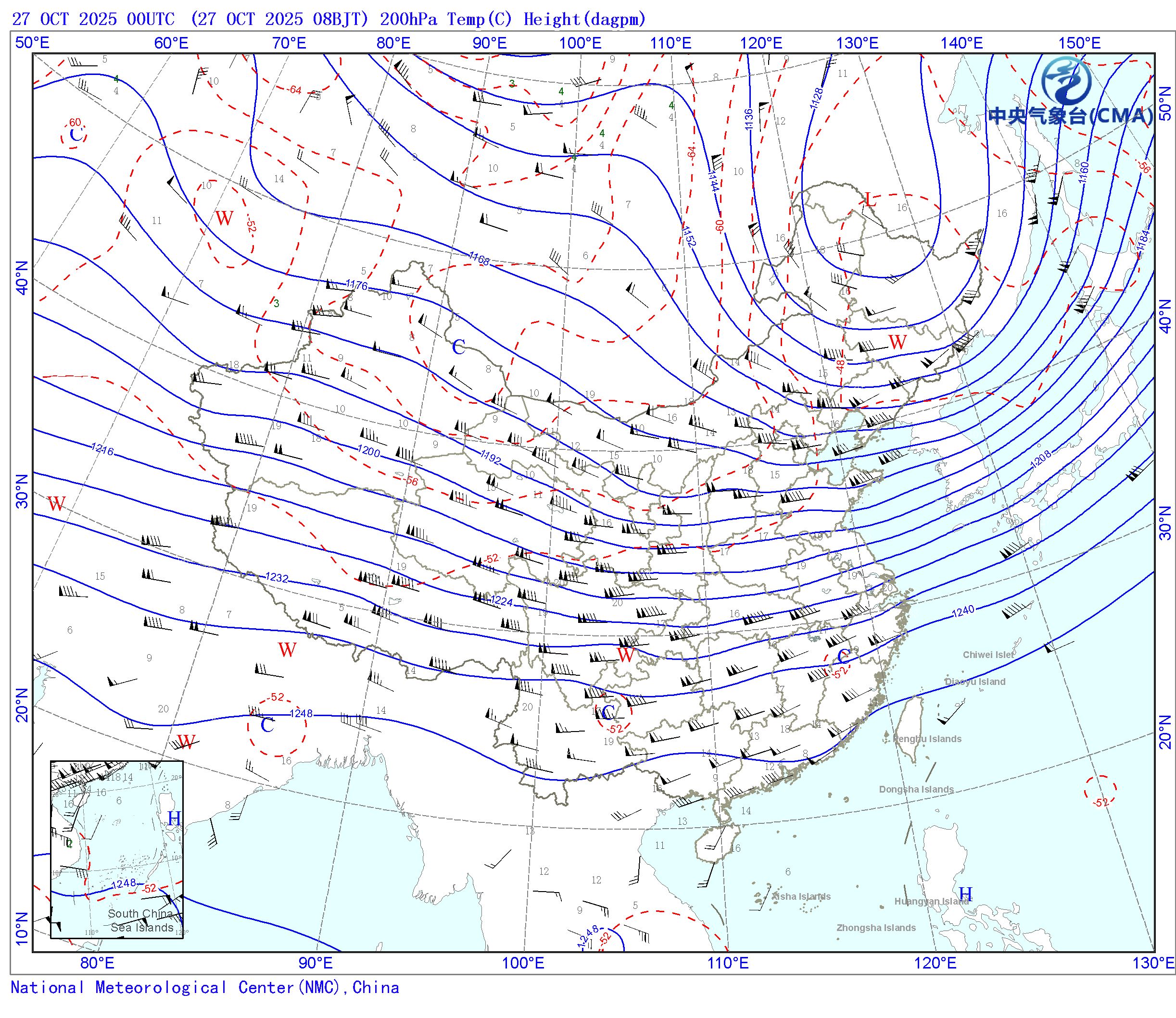站点的填图要素包括:风向风速和温度露点差;天气系统符号包括:高压中心(H)、低压中心(L)、暖中心(W)、冷中心(C)和台风符号;蓝色等值线为等高线(单位dagpm);红色等值线为等温线(单位℃),其中零摄氏度以下以虚线显示。