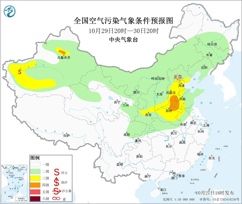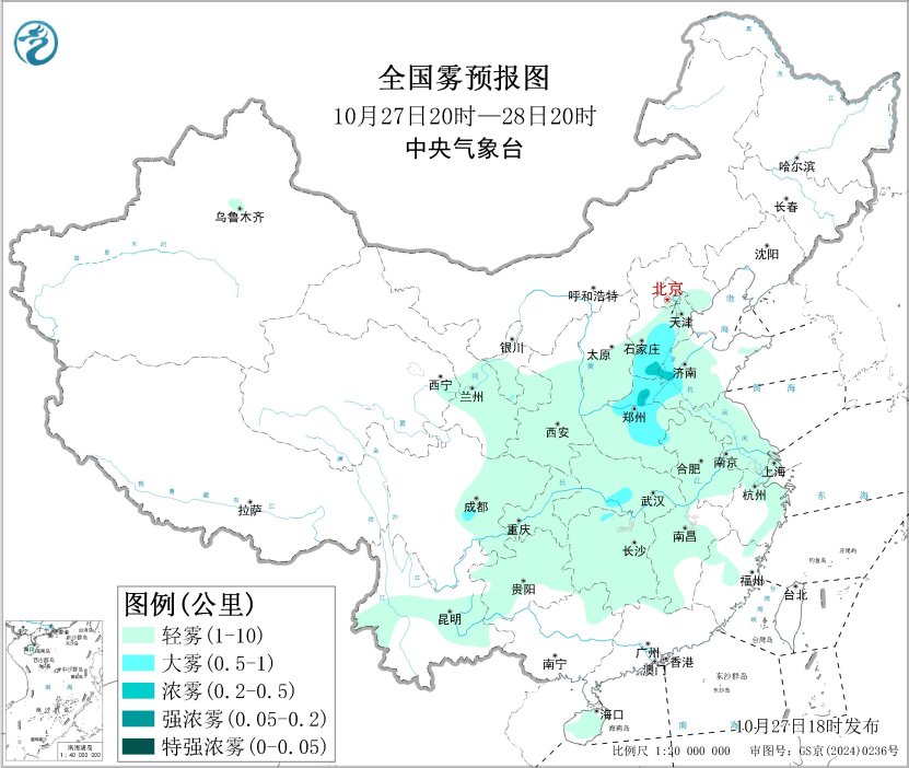 27日夜间至29日,华北中南部、黄淮西部大气扩散条件转差,区域中西部有轻度霾,部分地区有中度霾,30日,受冷空气影响,上述地区霾天气自北向南逐渐减弱或消散。另外,27日夜间至28日上午,河北南部、河南中北部、山东西部、湖北南部等地的部分地区有大雾天气,局地能见度不足500米。