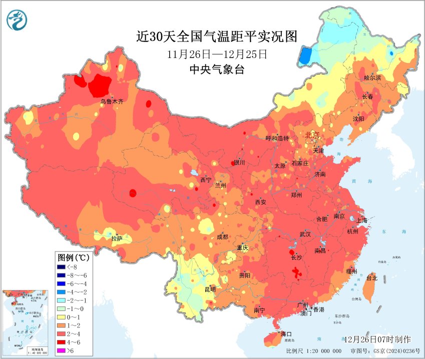 近30天全国平均气温距平图
