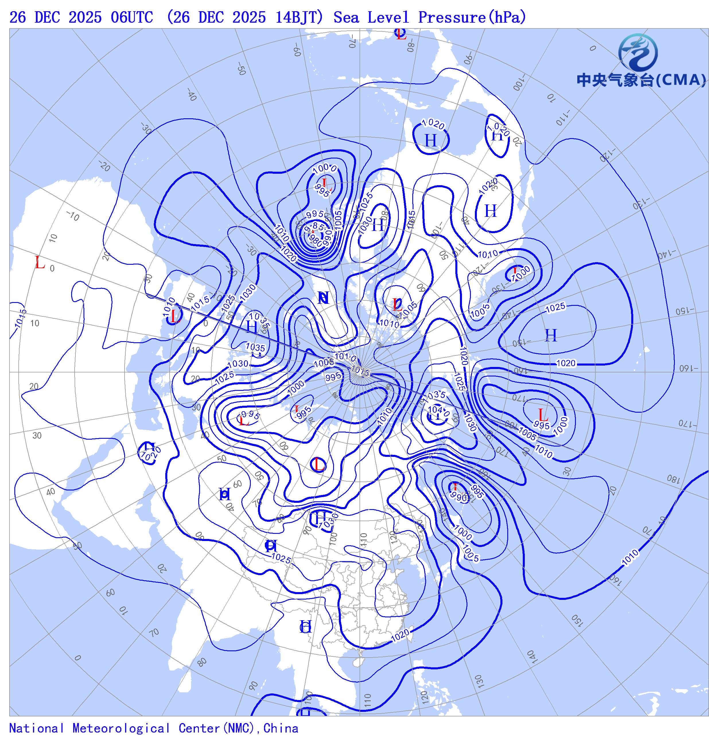 天气系统符号包括:高压中心(H)、低压中心(L)和台风符号;蓝色等值线为海平面气压场等压线(单位hPa)。