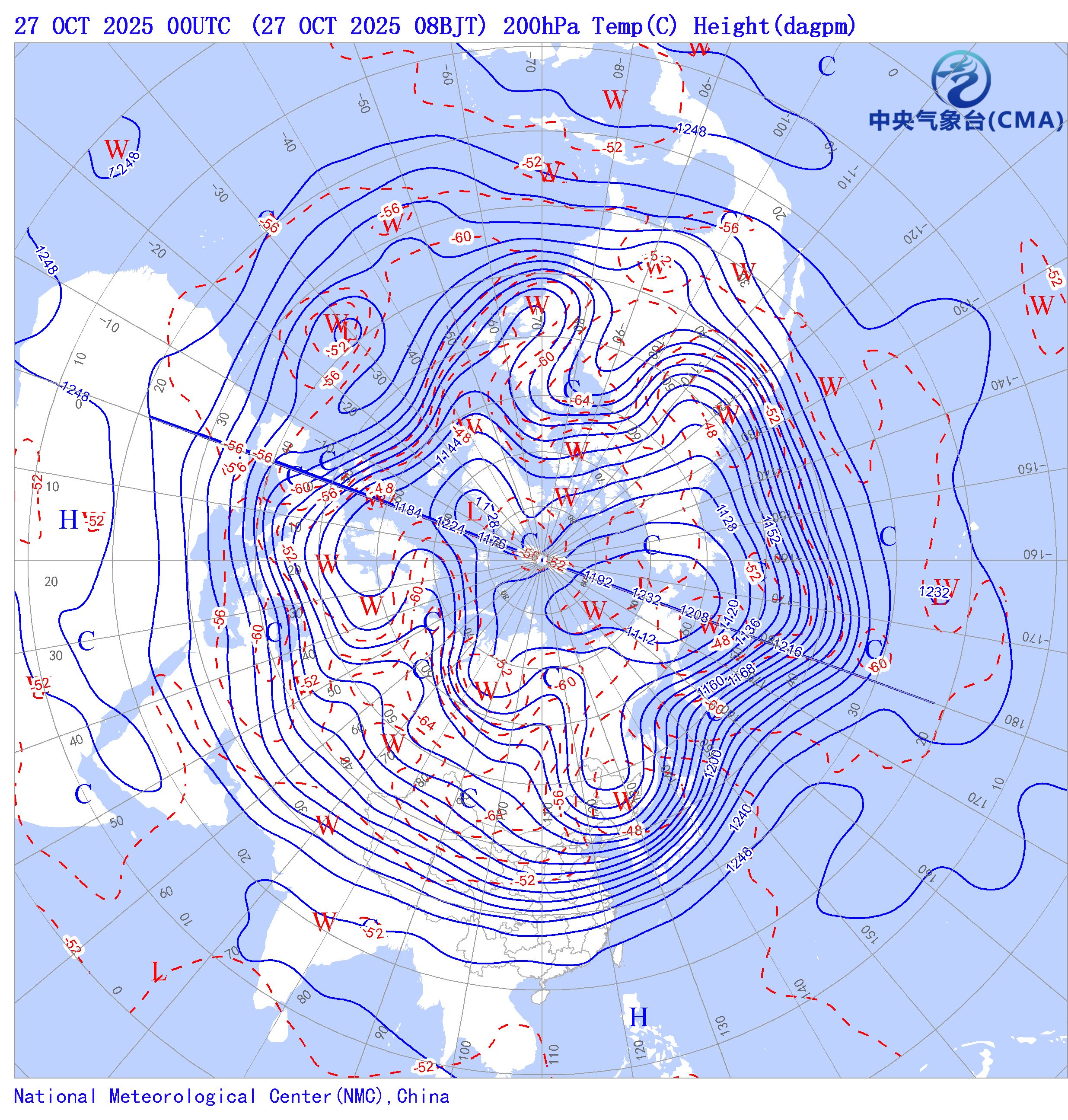 天气系统符号包括:高压中心(H)、低压中心(L)、暖中心(W)、冷中心(C)和台风符号;蓝色等值线为等高线(单位dagpm);红色等值线为等温线(单位℃),其中零摄氏度以下以虚线显示。