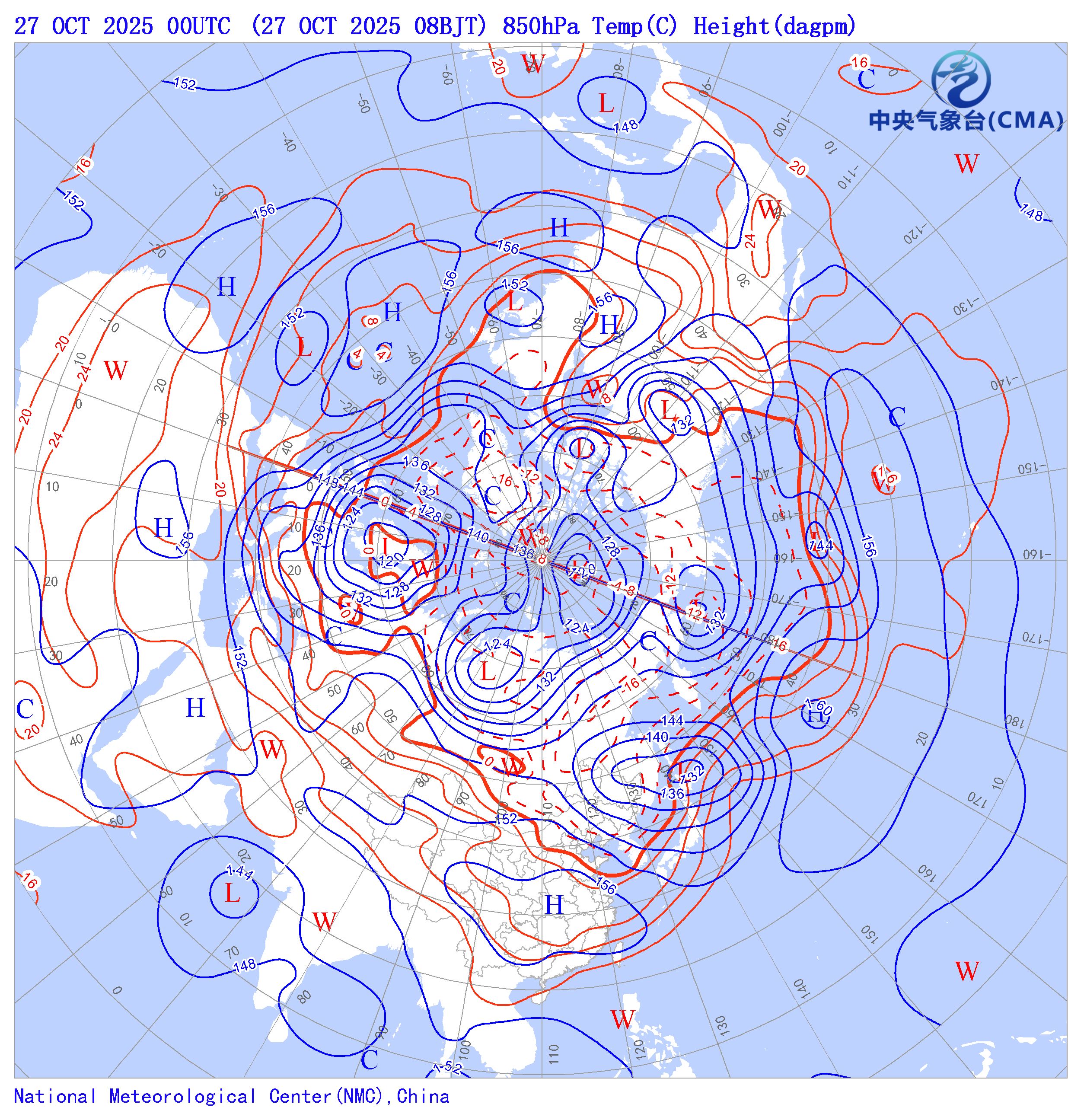 天气系统符号包括:高压中心(H)、低压中心(L)、暖中心(W)、冷中心(C)和台风符号;蓝色等值线为等高线(单位dagpm);红色等值线为等温线(单位℃),其中零摄氏度以下以虚线显示。