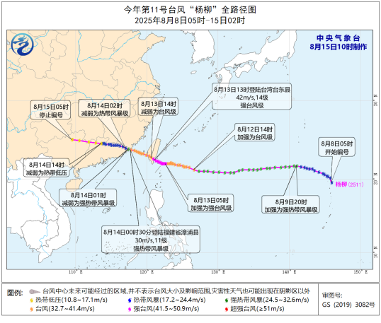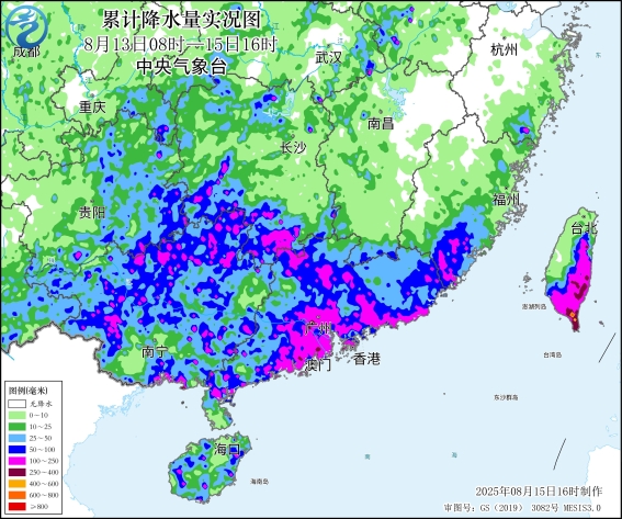华南江南等地出现强降雨。8月13日08时至15日16时,受“杨柳”及残余云系影响,华南、江南南部等地出现强降雨,台湾岛东部和南部、福建东南部、广东中部和沿海、广西、湖南南部等地部分地区累计降雨量有100~200毫米,珠江三角洲、台湾岛东南部250~350毫米,台湾屏东县局地648.5毫米。